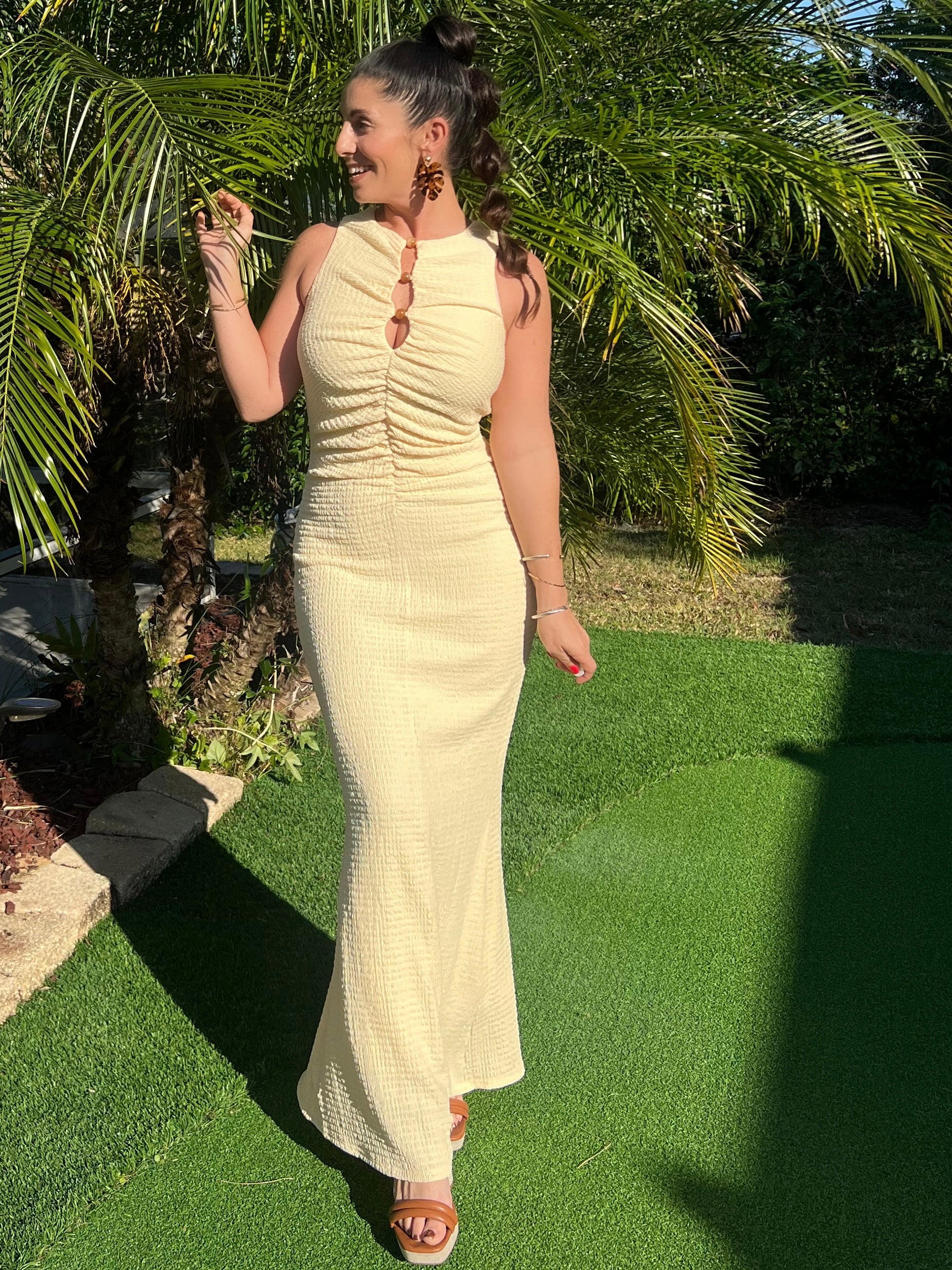 What an amazing fit! Loving the color and cut out detail with the brown beading detail. The stretch, texture, and lining of the dress make it so comfortable and oh so flattering!