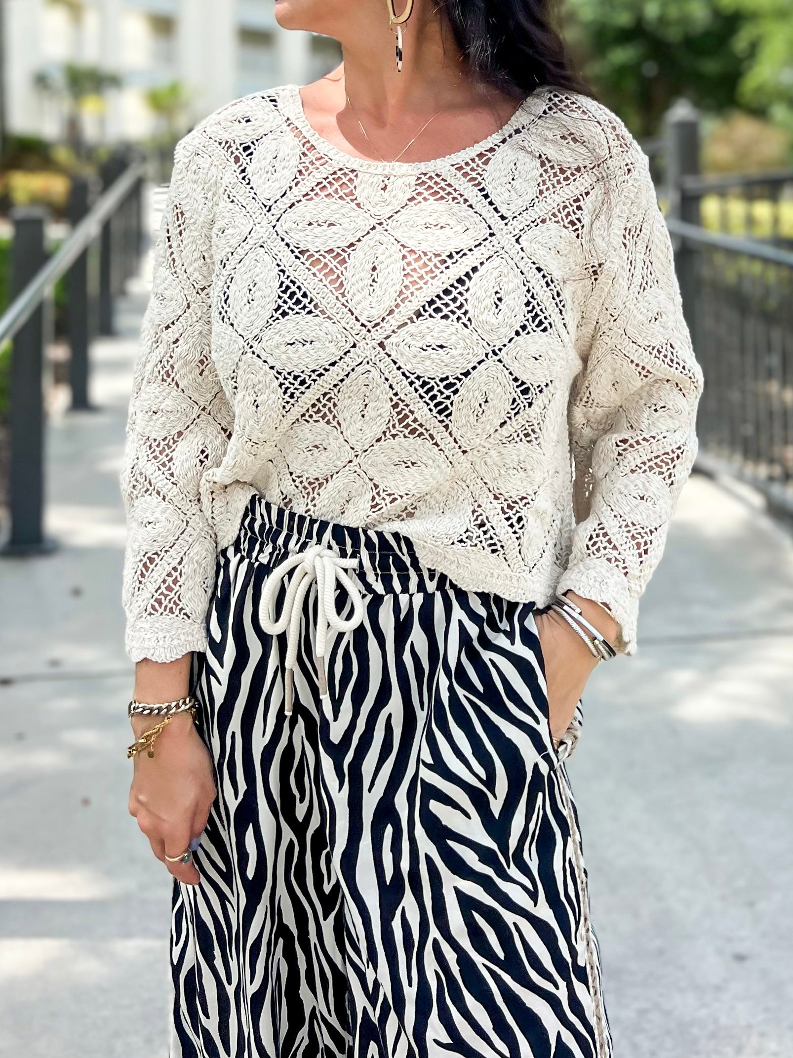 Made in Italy, this piece is a staple and one to keep forever. We love the sand color and timeless crochet design . Sophisticated and elegant, or coastal and beachy..we love it both ways!
