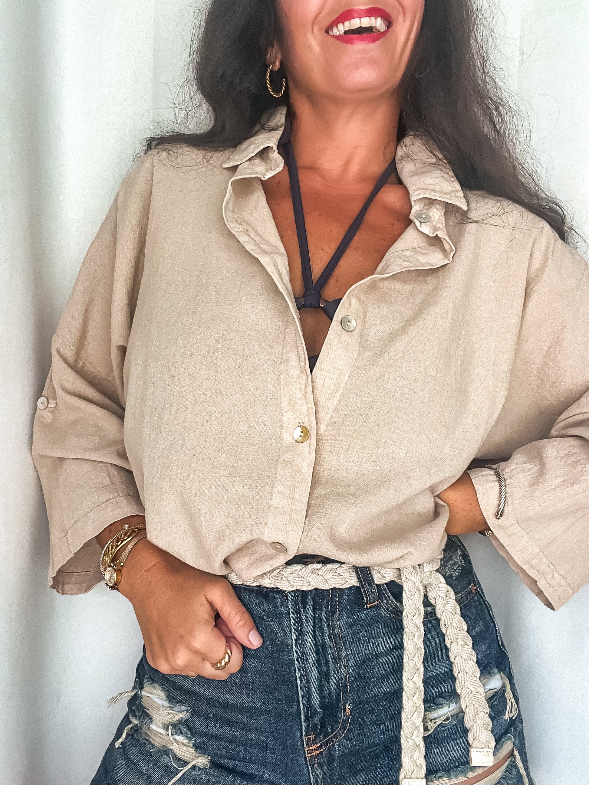 This is our Peruvian cotton brand that is so perfect for coastal weather, and also a timeless collection! This shirt is oversized through the body and can be styled so many ways. It has a 3/4 sleeve and can also be rolled up.